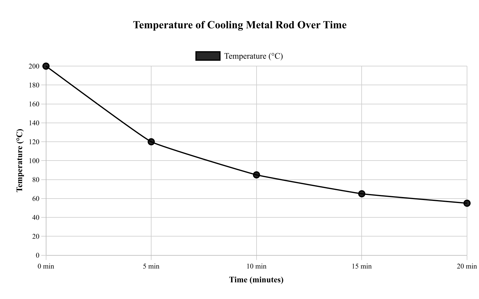 The curve decreases rapidly at first and then more slowly, passing through approximately (0, 200), (5, 120), (10, 85), (15, 65), and (20, 55). Caption: Temperature measurements were taken every 5 minutes as the rod cooled; points are connected to show the trend.