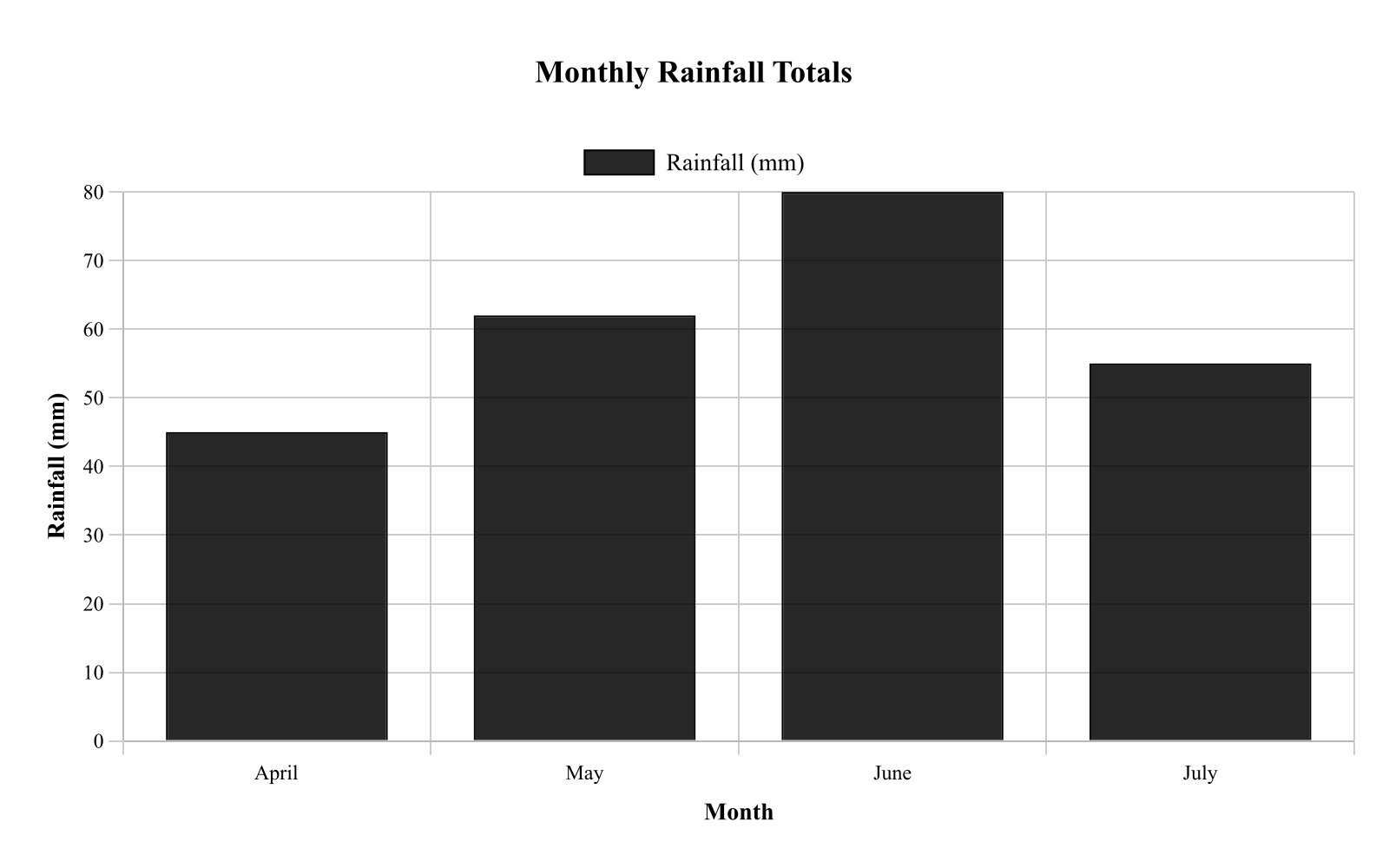 Bar heights are approximately: April 45 mm, May 62 mm, June 80 mm, July 55 mm. Caption: Each bar represents the total rainfall measured for that month; values can be compared by bar height.