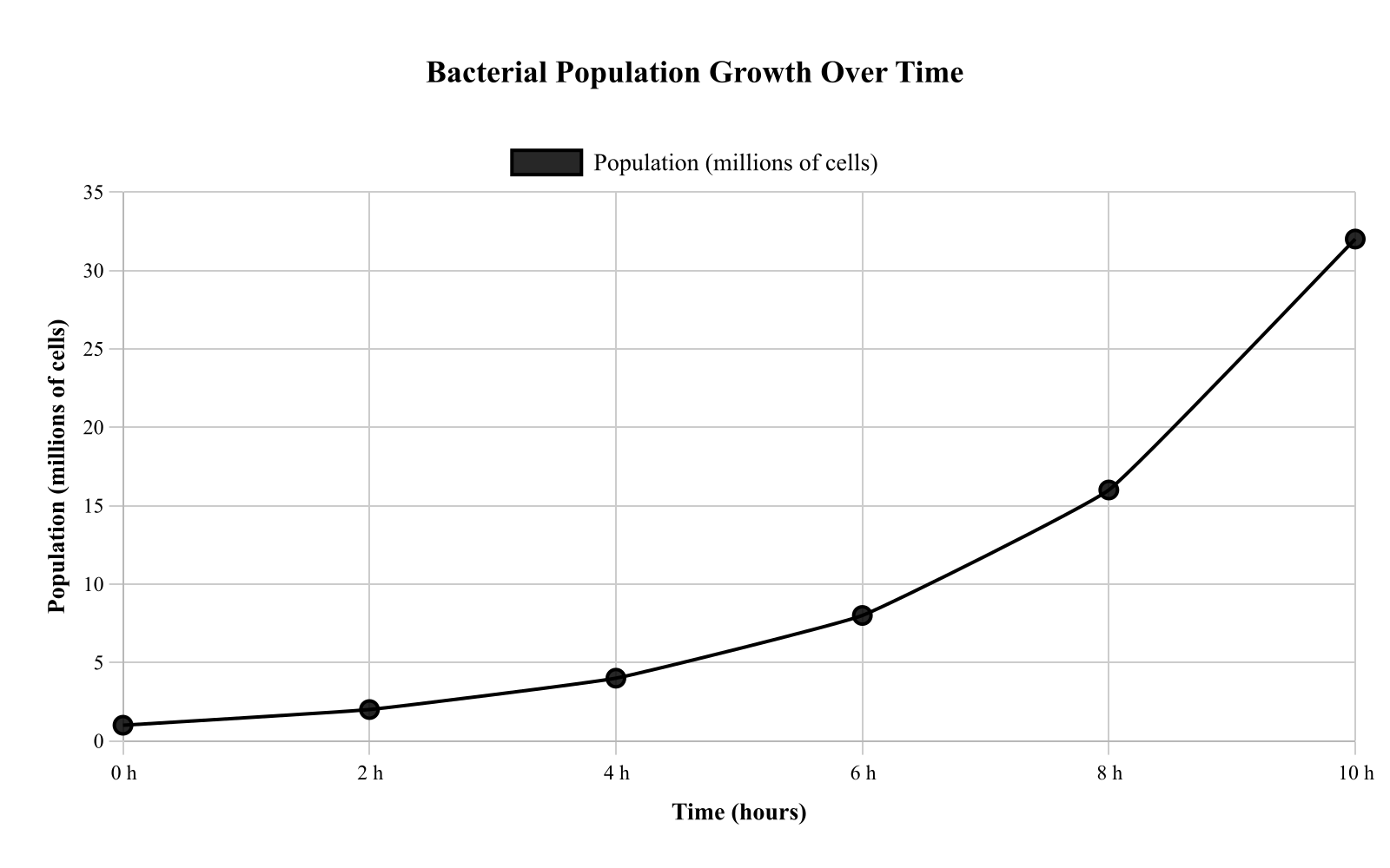 The graph depicts bacterial population doubling every 2 hours, from 1 at 0 h, to 2 at 2 h, 4 at 4 h, 8 at 6 h, and 16 at 8 h. Extrapolating the trend to 10 h gives 32 million cells, as it doubles from 16. This is correct because continuing the pattern assumes the same growth rate, illustrating extrapolation from graphs. Option C, 24 million, might result from adding instead of multiplying.