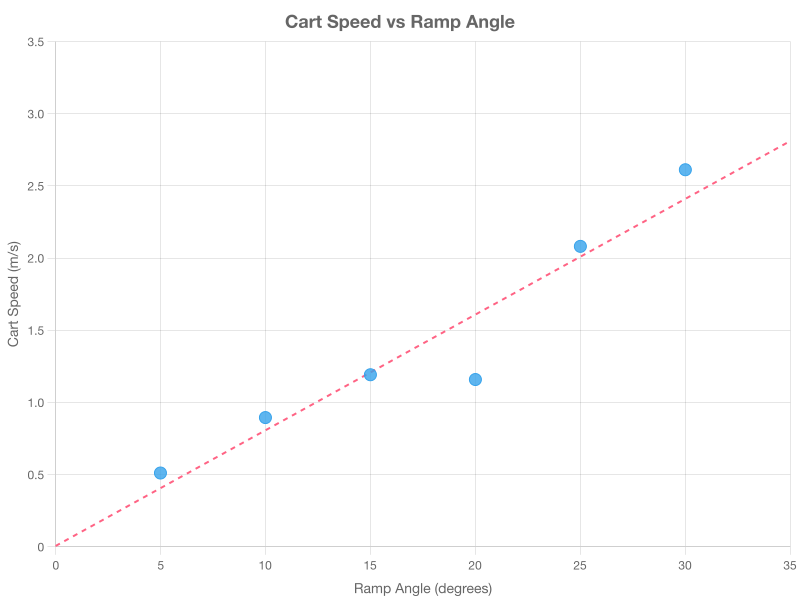 The scatter plot shows cart speed increasing with ramp angle, with points clustering around (5, 0.6), (10, 1.0), (15, 1.4), (20, 1.9), (25, 2.3), and (30, 2.8). The overall trend is a steady rise, best described as speed generally increasing as ramp angle increases. This is correct because the pattern of points demonstrates a positive correlation, illustrating how to interpret trends in scatter plots. Option D might mislead if someone sees a false peak at 15° due to not viewing the full trend.