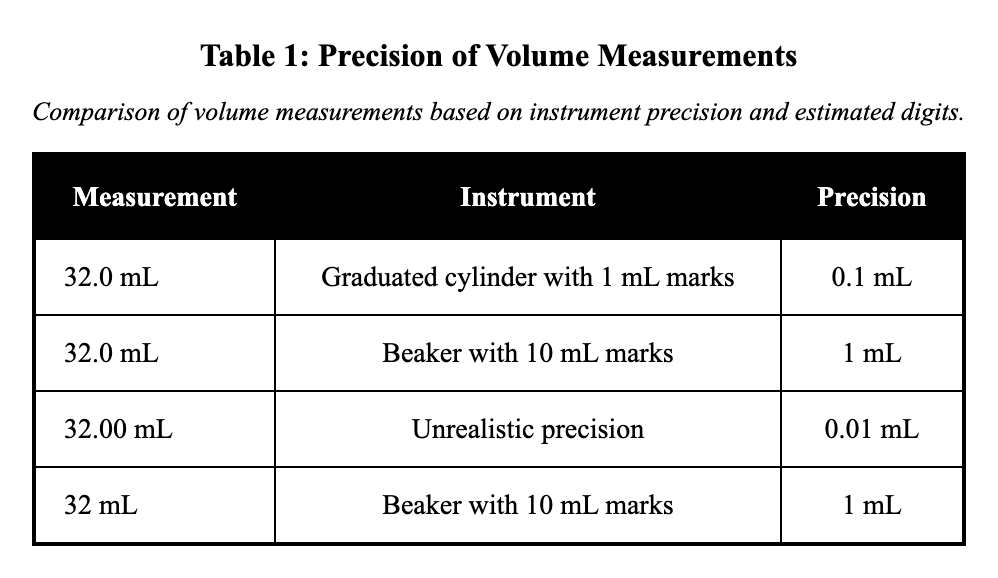 Two instruments are available to measure a solution’s volume: (1) a beaker with marks every $10,\mathrm{mL}$ and (2) a graduated cylinder with marks every $1,\mathrm{mL}$. A student follows the usual rule of recording one estimated digit beyond the smallest marked division.