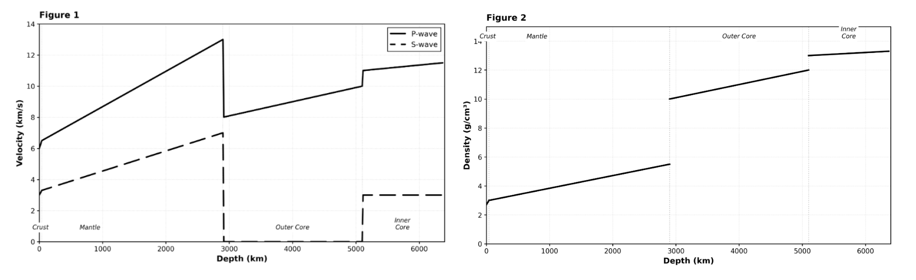 The velocity of these waves depends on the density and physical state (solid or liquid) of the material they travel through. Abrupt changes in velocity indicate boundaries between Earth's layers.