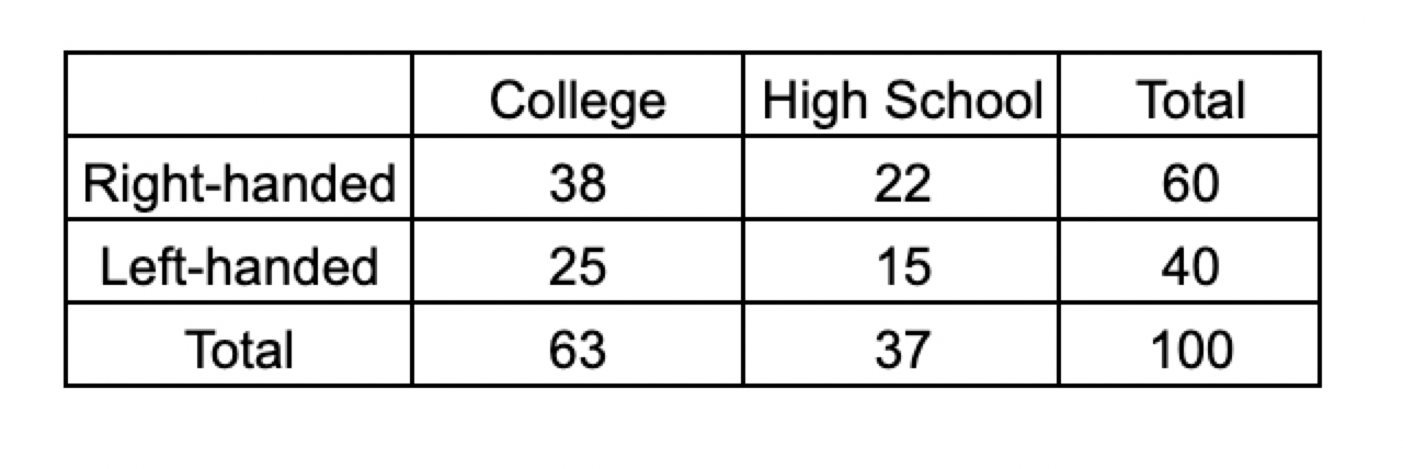The question asks "if a left-handed player is selected at random" meaning that the denominator should be the total of the left-handed row, which is 40. Then the numerator is the number of left-handed players in the high school column, or 15. The calculation then is 15/40 = 37.5%.