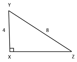 This is a 30-60-90 triangle (hypotenuse is twice one leg). Side XZ = 4√3. Area = ½ × 4 × 4√3 = 8√3.